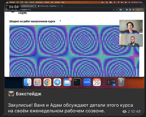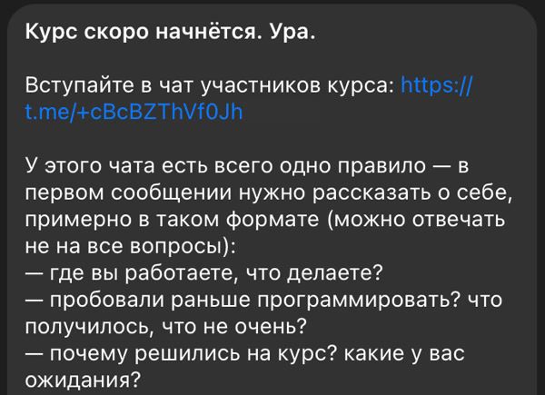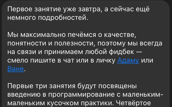 В целом курсом довольна! Ожидания оправдались! Возможно, тем, кто с кодом знаком поверхностно (как я), нужно больше уроков, может быть, какой-то более продолжительный курс.